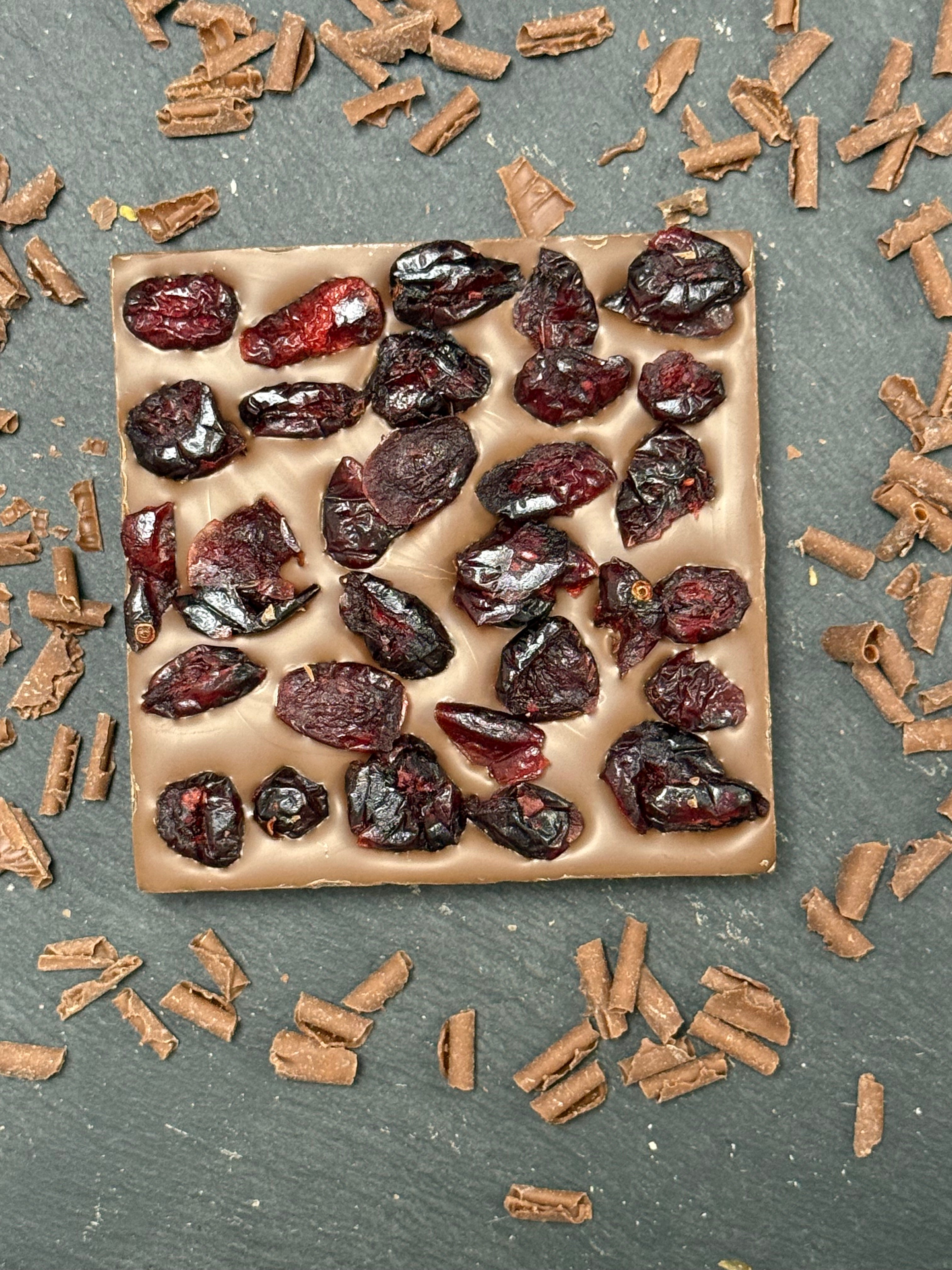 Milk chocolate sugar, cocoa butter, whole milk powder, cocoa mass, whey powder, soya lecithin E322, vanilla extract. Dried cranberries. May contain sulphites