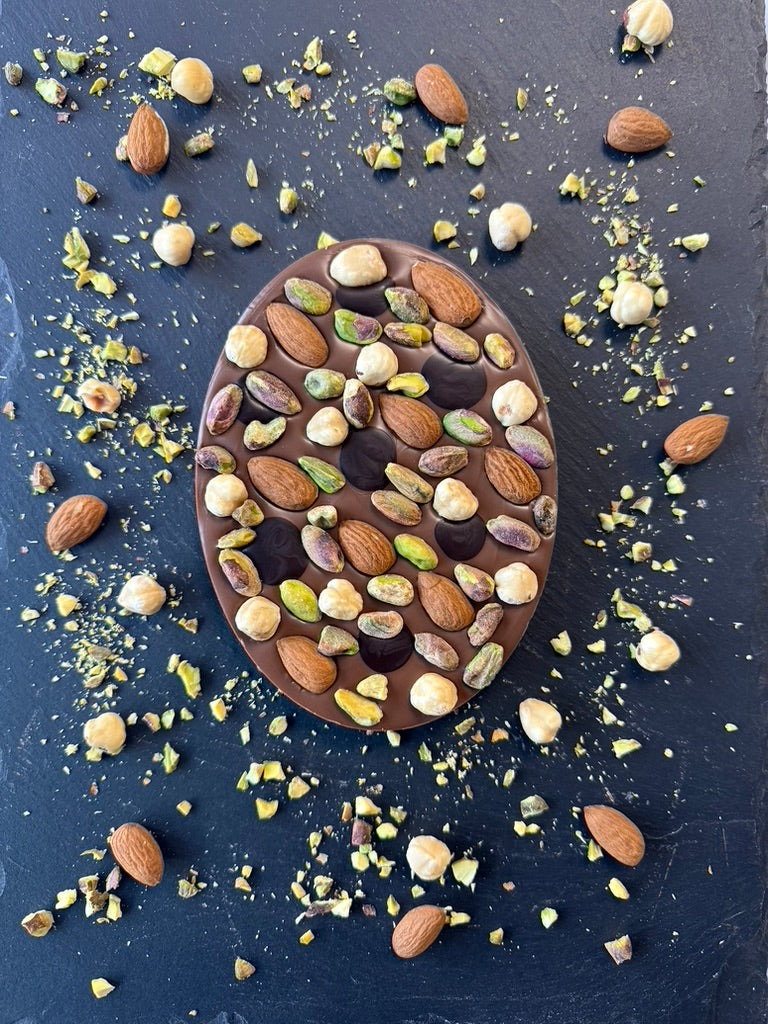 Generously studded with a delightful medley of whole pistachios, hazelnuts, and almonds, each bite delivers a satisfying crunch against our smooth milk chocolate base.
