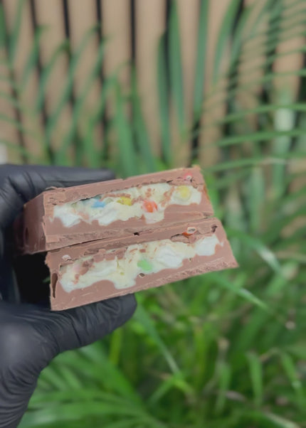 Indulge in a playful treat with our White Choc, Mallow & Candy Bar.
