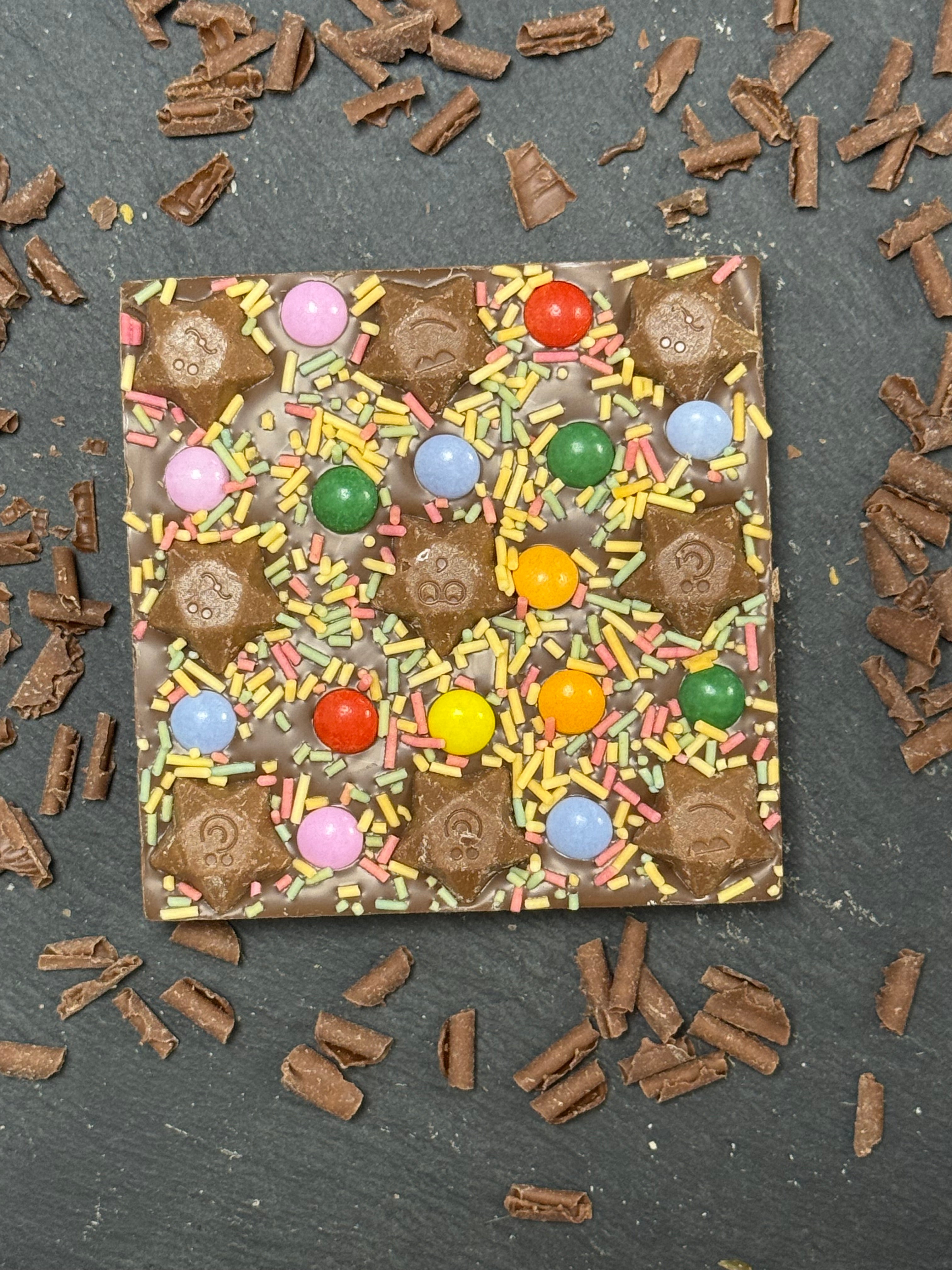 Celebrate with our vibrant Chocolate Star Mini Bloc—a showstopper crafted from our signature milk chocolate blend and crowned with twinkling mini milk chocolate stars, colourful chocolate beans, and a rainbow of sprinkles. It's a party in chocolate form, bursting with fun flavours and festive flair that'll make any moment feel special.