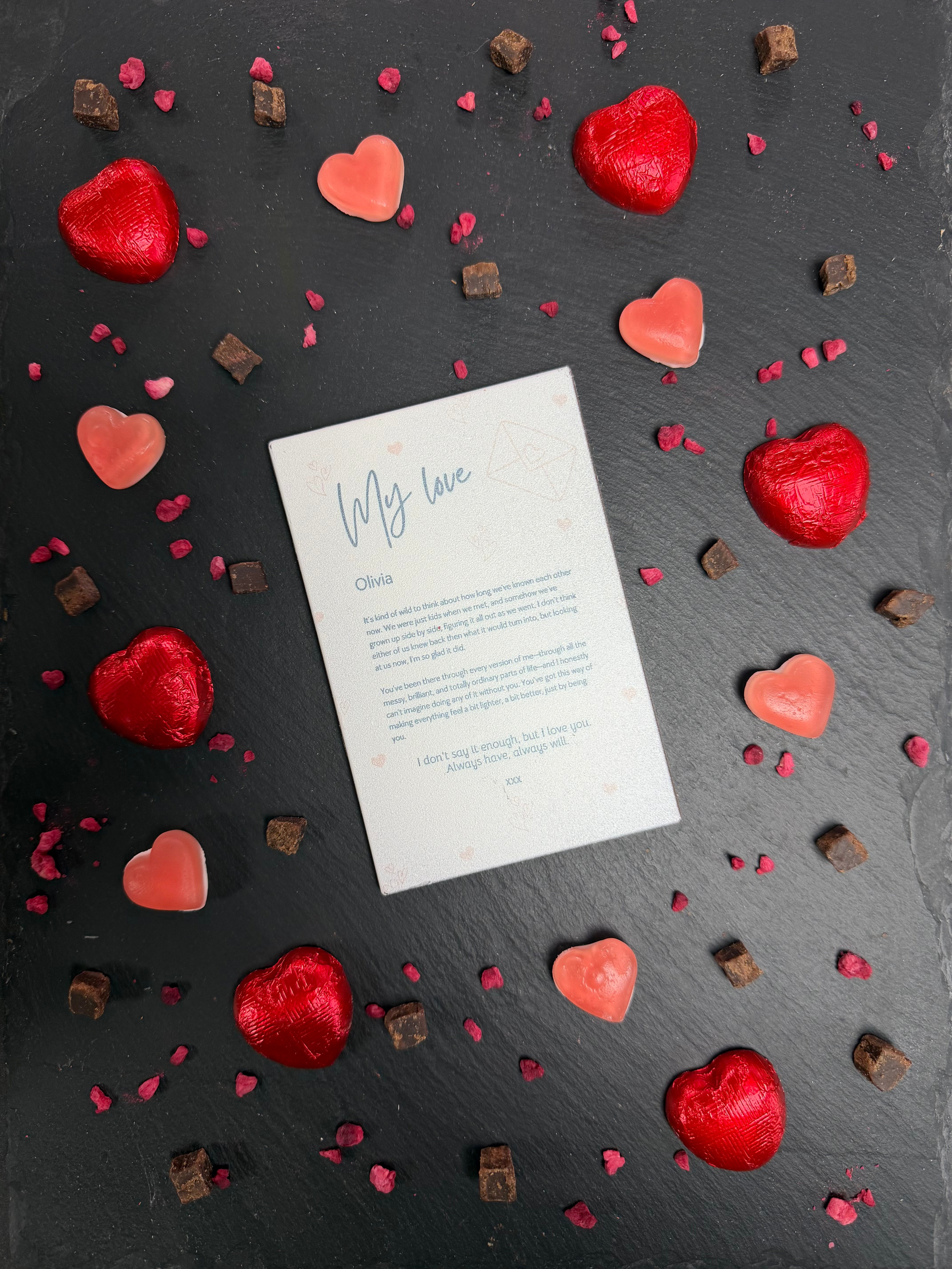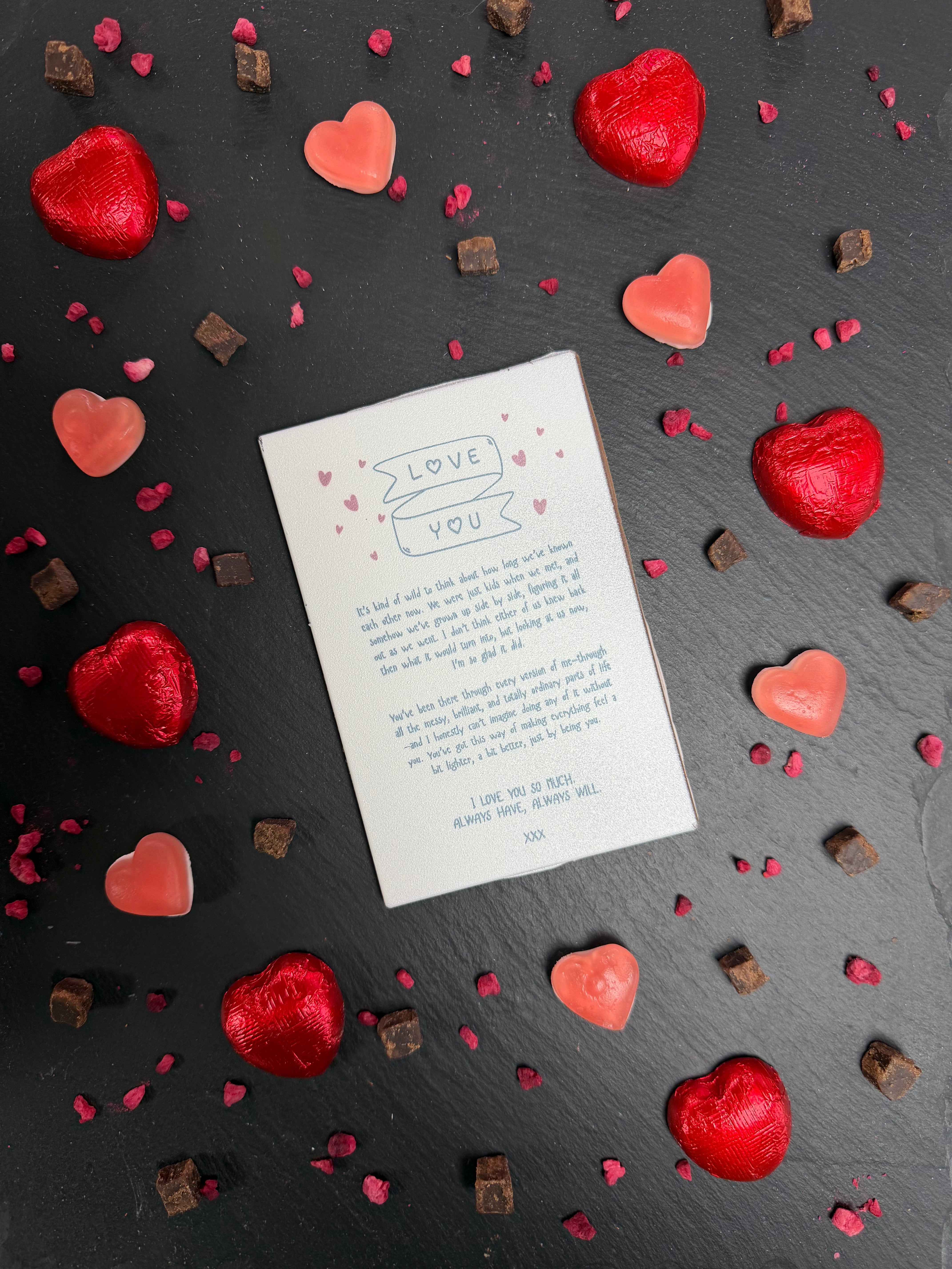 Our edible love letters let you personalise a handwritten-style message (up to 350 characters) printed directly onto creamy milk chocolate using food-safe ink.