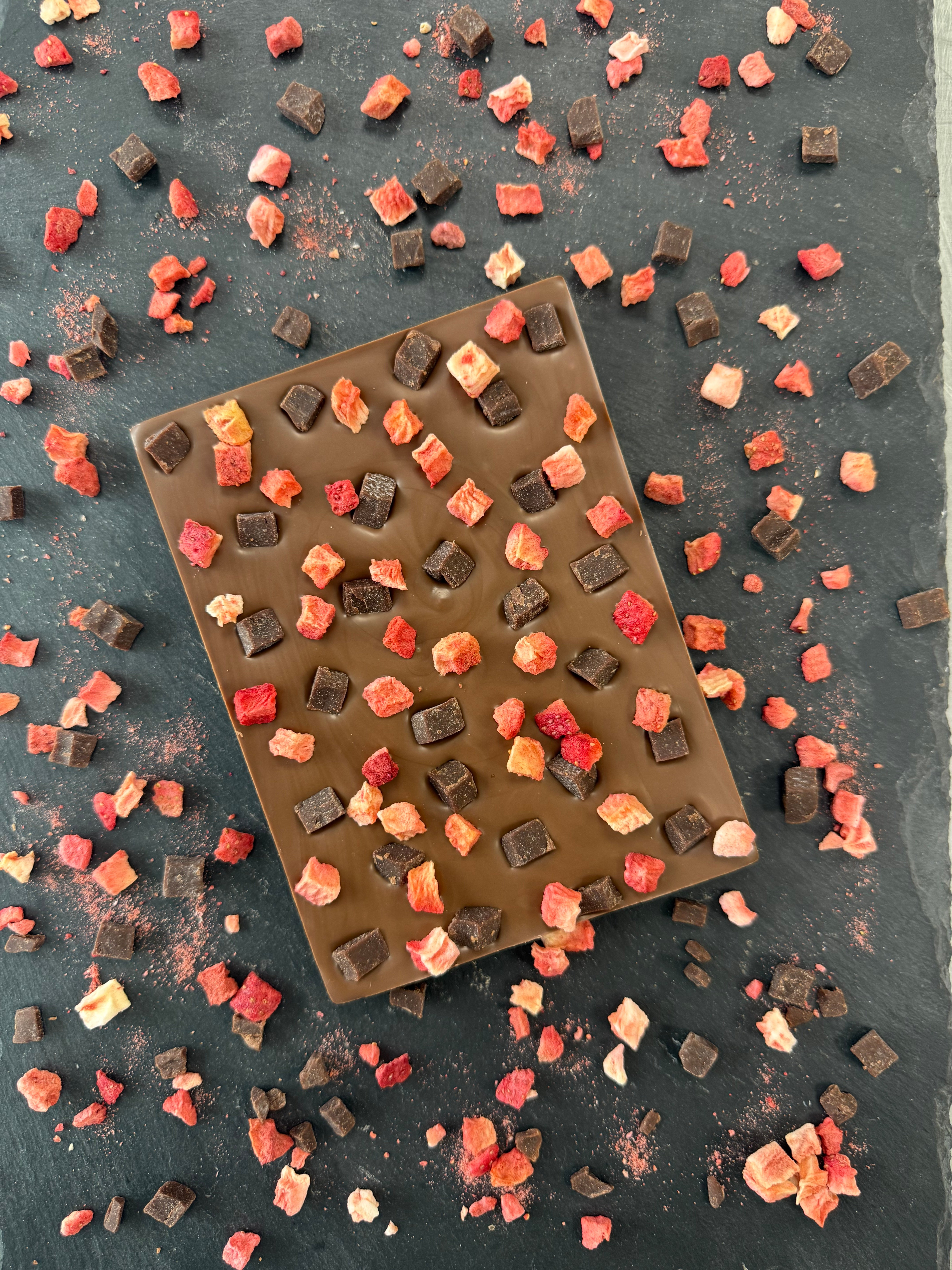 The ultimate trio arrives in our Strawberry Fudge Brownie Bloc. We took the timeless romance of chocolate and strawberries, then threw in decadent chocolate fudge brownie chunks because why choose? Fruity sweetness dances with rich chocolate indulgence in every bite, creating a flavour combination that's equal parts elegant and utterly irresistible. It's the dessert lover's dream wrapped up in one glorious chocolate package—proof that the best things really do come in threes.