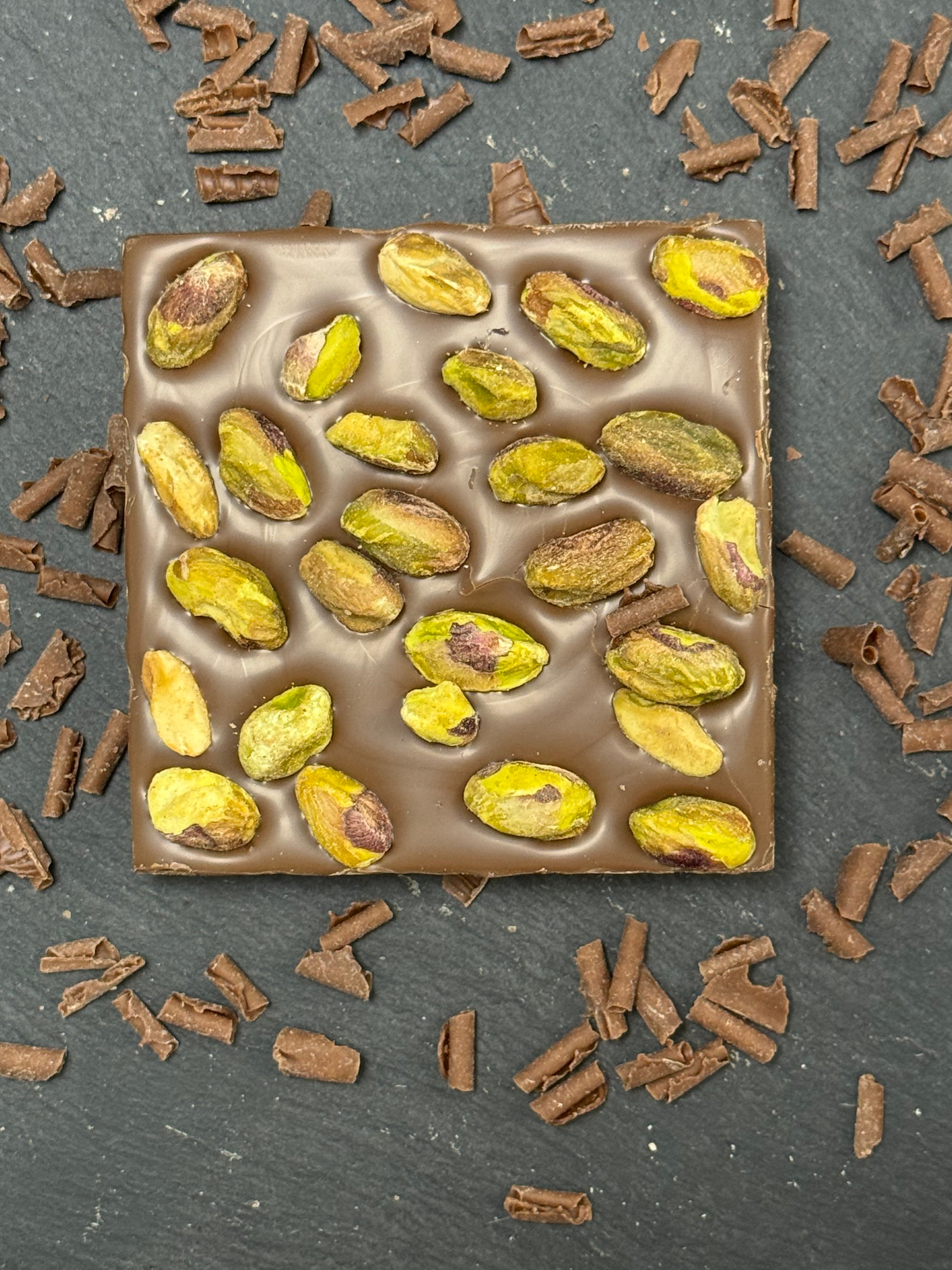 Milk chocolate sugar, cocoa butter, whole milk powder, cocoa mass, whey powder, soya lecithin E322, vanilla extract. Pistachios